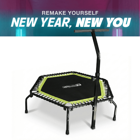 The MD Buddy 6 sided rebounder is the perfect size for home use and includes the safety handle that adjusts to fit the user height. The low-impact, bungee system makes it easier on your joints and also quieter than a spring-styled trampoline. It's also very easy to assemble and comes folded in box for transport.